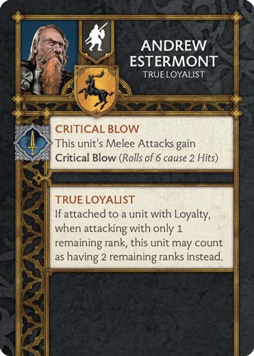 Si elle est attachée à une unité avec Loyauté, quand elle attaque avec seulement 1 rang restant, cette unité peut compter comme ayant 2 rangs restants à la place.