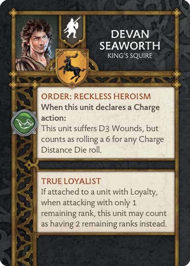 S’il est attaché à une unité avec Loyauté, quand elle attaque avec seulement 1 rang restant, cette unité peut compter comme ayant 2 rangs restants à la place.