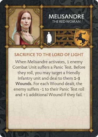 Lorsque Melisandre s’active, une Unité de Combat ennemie subit un Test de Panique. Avant le lancé de dé, vous pouvez cibler une unité d’infanterie alliée et lui infliger 1 à 3 Blessures. Pour chaque Blessure infligée, l’ennemi subit -1 à son jet de Test de Panique et +1 Blessure supplémentaire en cas d’échec.