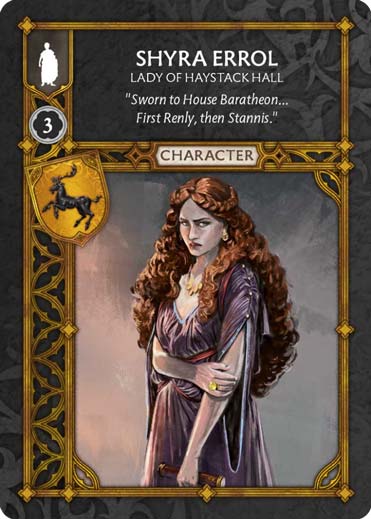 (Shyra Errol – Lady of Haystack Hall) ASOIAF.FR > Factions > Baratheon > (Shyra Errol – Lady of Haystack Hall) (Shyra Errol – Lady of Haystack Hall) Fonction : Unité Non-Combattante Type : Unité Non-Combattante Coût : 3 Maison : Baratheon Où trouver ? : Boîte de base Baratheon Version : 1.4