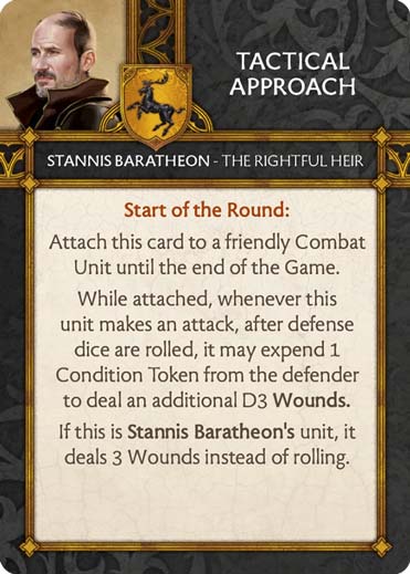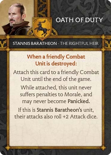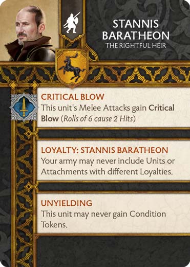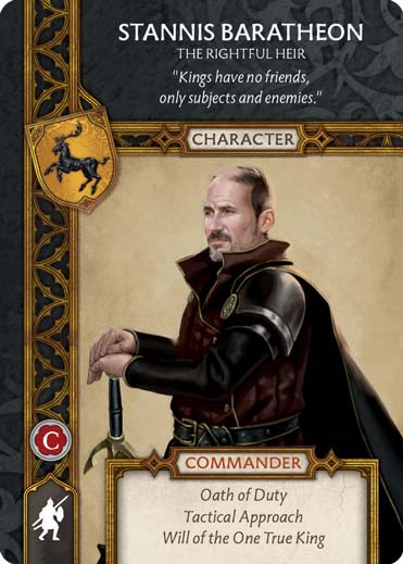 Stannis Baratheon – L’Héritier Légitime (Stannis Baratheon – The Rightful Heir) ASOIAF.FR > Factions > Baratheon > Stannis Baratheon – L’Héritier Légitime (Stannis Baratheon – The Rightful Heir) Stannis Baratheon – L’Héritier Légitime (Stannis Baratheon – The Rightful Heir) Fonction : Attachement / Général Type : Infanterie Coût : 0 Maison : Baratheon Où trouver ? : Boite de base Baratheon Version : 1.4 Cartes de Général (US)