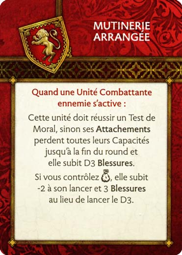 Je Rugis ! : Les Lannister ne gagnent pas par le combat brut, mais en provoquant la Panique chez l’ennemi. Ils ont également plusieurs façons de réduire le Moral ennemi pour atteindre cet objectif.