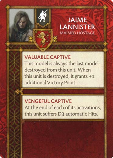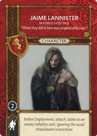 (Jaime Lannister – Maimed Hostage) ASOIAF.FR > Factions > Lannister > (Jaime Lannister – Maimed Hostage) (Jaime Lannister – Maimed Hostage) Fonction : Attachement Type : Infanterie Coût : 2 Maison : Lannister Où trouver ? : nc