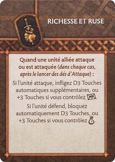 Parmi les personnages, nous retrouvons les Attachements (personnages qui rejoignent sur le champs de bataille une unité combattante, afin de lui apporter des compétences supplémentaires), ou bien des Unités Non-Combattantes (des UNC autrement dit, qui aident votre armée d’une autre manière que par la force, en utilisant la politique ou d’autres subterfuges, en se plaçant sur le Tableau Stratégique).