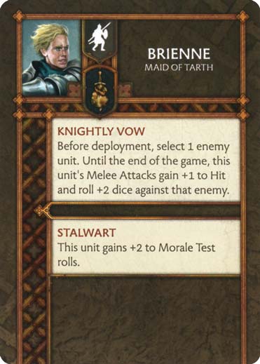 Brienne – Pucelle de Torth (Brienne – Maid of Tarth) ASOIAF.FR > Factions > Neutres (Neutral) > Brienne – Pucelle de Torth (Brienne – Maid of Tarth) Brienne – Pucelle de Torth (Brienne – Maid of Tarth) Fonction : Attachement Type : Infanterie Coût : 2 Maison : Neutres Où trouver ? : nc Version : 1.4