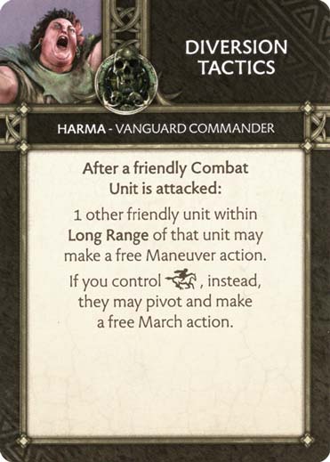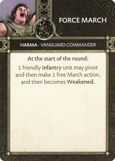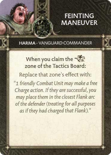 Certainement la carte la plus puissante en notre possession, qui permettra non seulement d’effectuer une Charge gratuite mais aussi de se placer sur un Flanc en bénéficiant des bonus associés. Elle permet aussi de libérer l’espace nécessaire en Front pour une deuxième unité, mais également d’activer l’ordre d’Harma. C’est certainement la carte que l’on aura le plus envie de retourner chercher dans la défausse avec la compétence de notre Commandant.