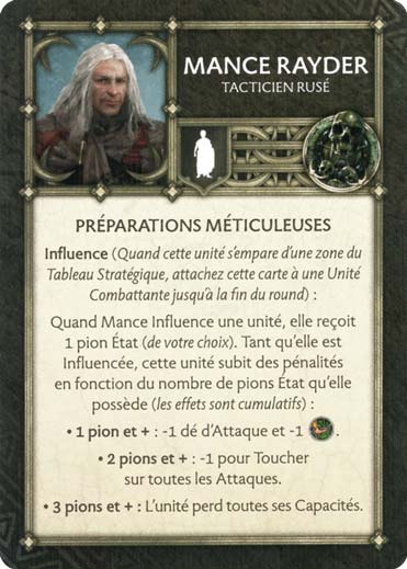 Mance Rayder va nous apporter une très bonne influence à chaque round, grâce à sa capacité de générer un Pion Etat, il permettra de rendre une unité adverse moins mobile, moins puissante, facilitant ainsi les mouvements de nos troupes. Il faudra faire attention à n’utiliser les Pions qu’aux moments opportuns sur notre adversaire, ceci afin de pouvoir bénéficier de sa compétence la plus puissante… à savoir retirer les capacités d’une unité si elle possède les 3 Pions Etats différents. Cette capacité est très forte autant défensivement qu’offensivement, supprimant les compétences des unités, mais aussi de leurs Attachements.