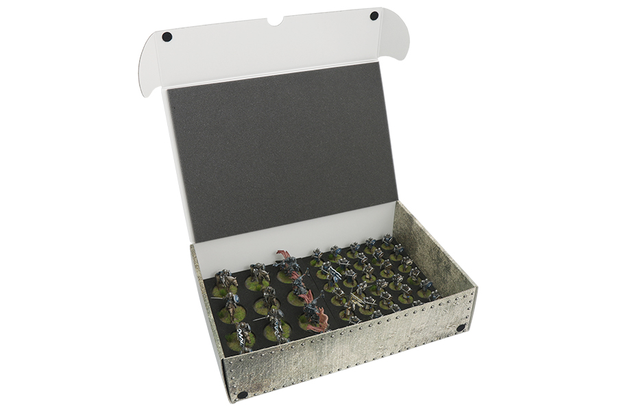 Pour ceux qui commencent à avoir beaucoup d’unités, de plusieurs factions, se pose la question du rangement, en particulier des cartes. Voici une valise de rangement, pas officiellement adaptée au jeu, mais qui fait le job !