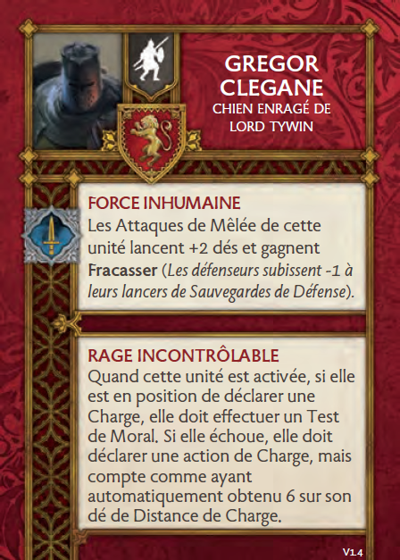 La Maison Lannister cherche à garder le contrôle du Trône de Fer et est prête à dépenser sans compter pour y parvenir. Leurs coffres sont ouverts et ils engagent les meilleurs soldats de Westeros pour diriger leurs unités. Ces vétérans du combat apportent une expertise, une entrainement et une ruse que l’on ne trouve pas chez le soldat de base. Ils peuvent élever une unité ordinaire au rang d’élite par leur simple présence.